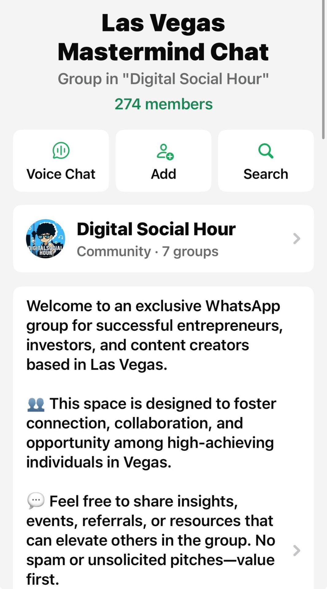 We also have local WhatsApp chats for people that live in Las Vegas, Los Angeles, Miami and New York. More cities will be coming soon.